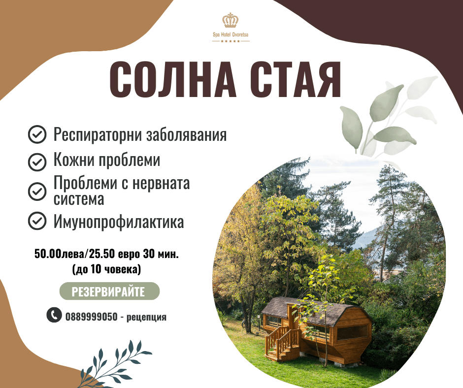 Резервирайте солната стая за Вас и Вашите любими хора на рецепцията в хотела или на тел. 0889999050.